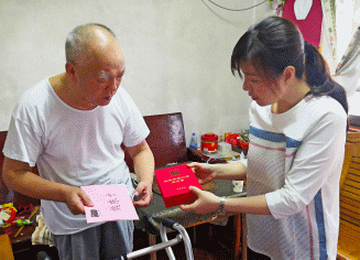 (图为“七一”前夕,局党组成员、副局长章洁入户慰问老党员,并颁发“光荣在党50年”荣誉纪念章 摄影:覃家德 )